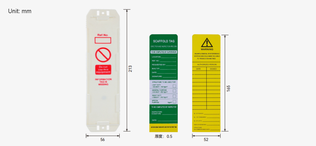 红牌:卡纸未嵌入挂牌,以挂牌本身红色的警示文字和图案展示,表示脚手架禁止使用。